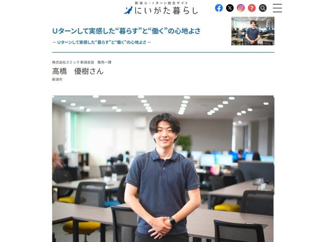 新潟県が運営する、U・Iターン促進を目的としたWEBサイト「にいがた暮らし」というサイトがあります。そのサイト内に、Uターン就職を経験した先輩社員の声が掲載されているページがあるのですが、スミックの営業が掲載されました。